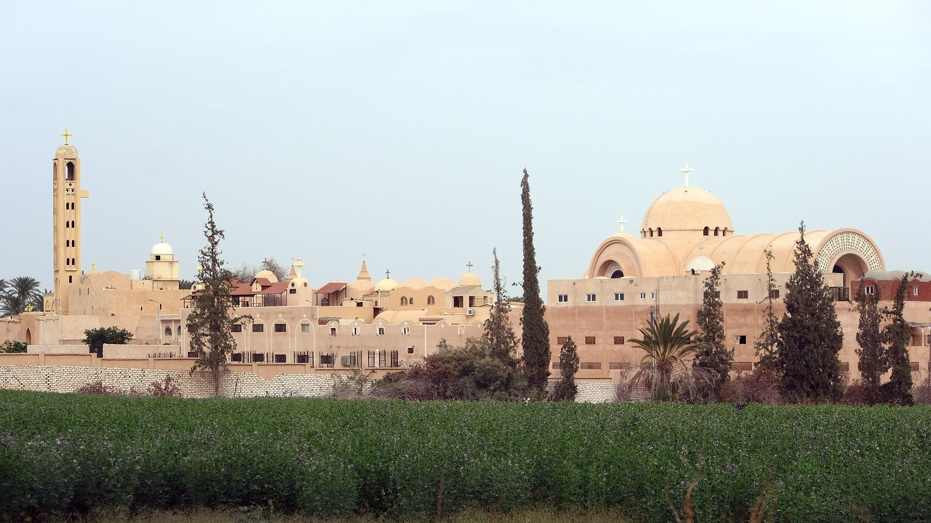 Zuletzt klettern wir eine schmale Treppe hinauf aufs Dach des Wehrturms. Jetzt erst erkenne ich, dass die Ausmaße der neuen Klosterbauten die antiken Bereiche deutlich übertreffen. Im Kloster Pischoi leben etwa 200 Mönche und 20 Novizen. Kosman weist nach Süden. „Die rötlichen Gebäude sind die päpstliche Residenz – der kleine Vatikan.“ Jüngeren Datums sind auch die im Jahr 2000 fertiggestellte Kathedrale, ein Konferenzzentrum, eine Klinik, Exerzitienhäuser, Unterkünfte für Mönche und Gäste. Dahinter liegen landwirtschaftliche Gebäude: Ställe für Hühner, Schafe, Kühe, Hallen für die Landmaschinen zum Gemüseanbau. Knapp jenseits des Klosterareals wurde in der freien Landschaft eine Moschee errichtet. Das sei in Nachbarschaft zu koptischen Einrichtungen üblich, hatte mir der Fahrer erklärt. Auch ich war in Anaphora sehr zeitig in der Früh durch die elektronisch verstärkte Stimme eines Muezzins zum Morgengebet gerufen worden.