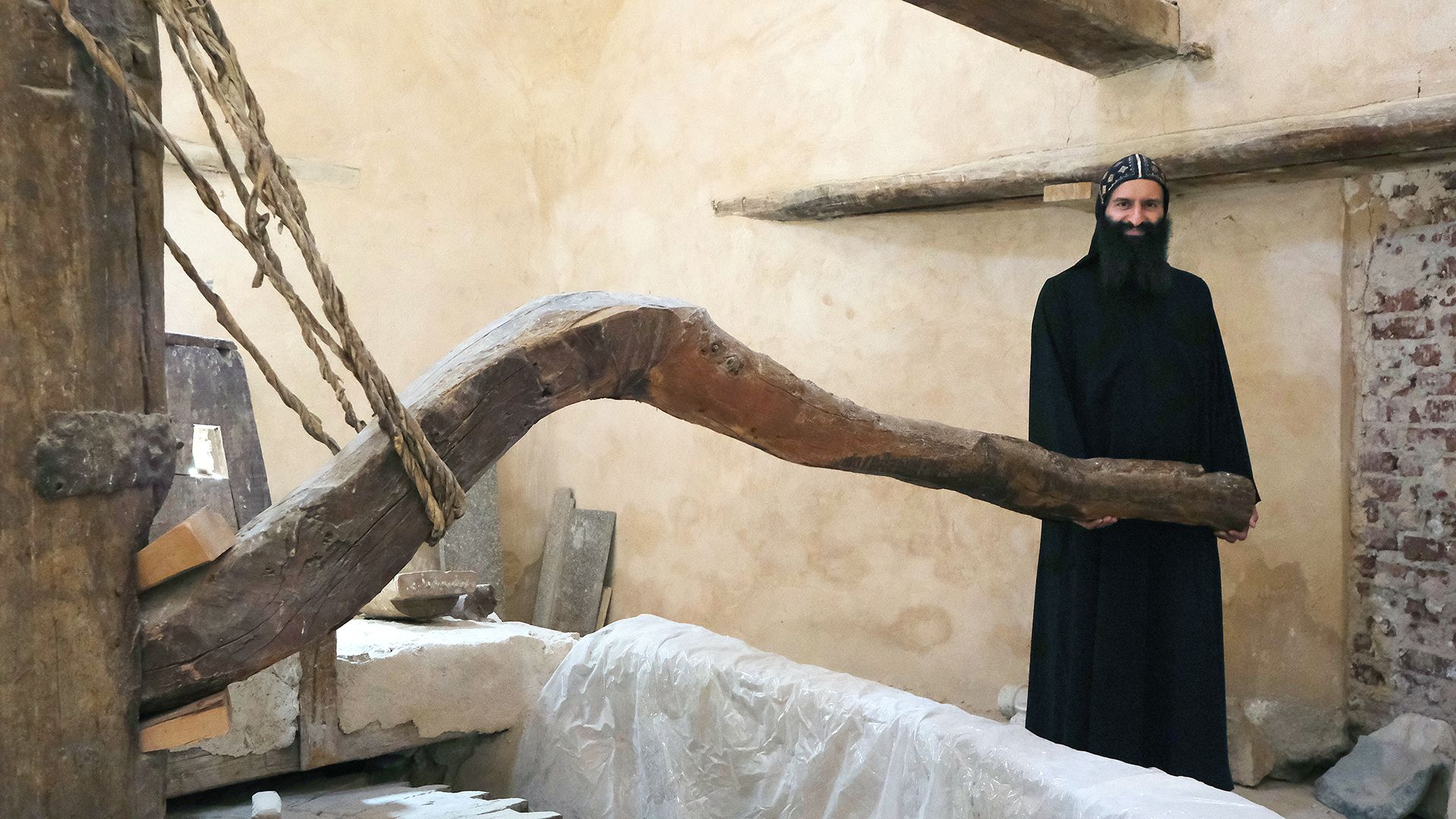 Pater Kosman ist in Hamburg aufgewachsen, er hat Medizin studiert und gerade Bereitschaftsdienst. Ab und an klingelt das Handy während unseres Rundgangs. Gegründet wurde das Kloster Pischoi im 5. Jahrhundert vom gleichnamigen Einsiedler. Aus dieser Zeit stammt der Brunnen der Märtyrer. „Seinen Namen hat der Brunnen noch aus der Zeit der zweiten Welle der Berberattacken im fünften Jahrhundert. Im Makarios-Kloster wurden bei einem Überfall 49 Mönche getötet. Die Berber haben anschließend ihre Schwerter in diesem Brunnen gewaschen. Er war für sein gutes Wasser bekannt, aber er lag damals frei in der Landschaft. Die ersten Mönche, Eremiten, suchten Orte, an denen es Wasser gab und Dattelpalmen – das Minimum zum Überleben. Und dazu eine Höhle als Unterkunft. Es war alles offene Fläche, Wüste. Es gab keine Zivilisation, Menschen, die den Mönchen hätten Schutz geben können.“