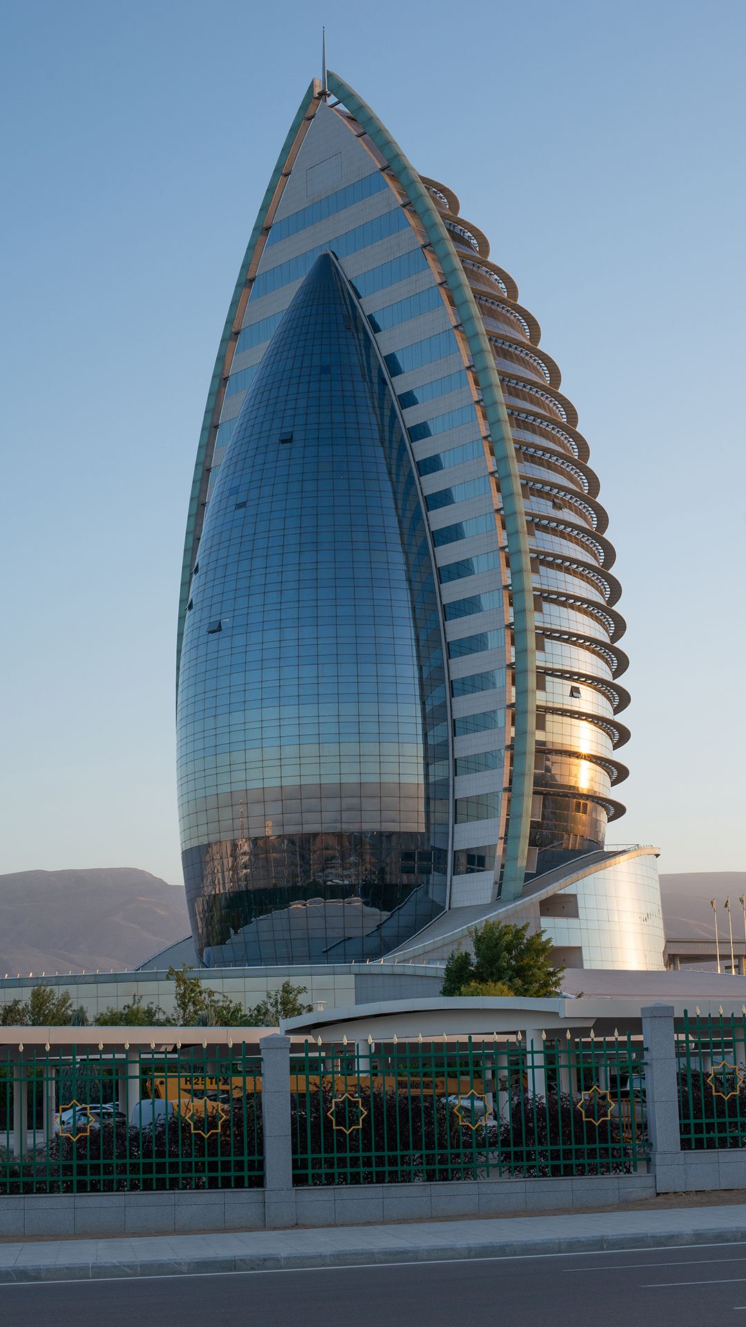 ▲ Das eiförmige Hotel Yyldyz wurde 2013 auf persönliche Anregung von Präsident Berdimuhamedow durch das französische Bauunternehmen Bouygues errichtet. Zu deutsch bedeutet der Name Stern. Das opulente Luxushotel trifft auch den Geschmack westlicher Besucher, wie 4,5 Sterne bei Tripadvisor beweisen. Nur das Frühstück wird von vielen als etwas phantasielos bemängelt, was durchaus landestypisch ist. Mit einer beeindruckenden Höhe von 107 m und 19 Stockwerken thront das Yyldyz auf einem Ausläufer des Kopet-Dag-Gebirges, was einen einzigartigen Panoramablick über Aschgabat ermöglicht. Nicht nur das Hotel selbst, sondern auch die Infrastruktur herum wurde sorgfältig geplant. Eine völlig überdimensionierte eigens errichtete Schnellstraße ermöglicht eine staufreie Anfahrt. An dem breiten Kreisverkehr wurden selbst die Straßenlaternen und Abfalleimer an das Design des Hotels angepasst. Die 155 Zimmer, von Standardzimmern bis hin zur opulenten Präsidentensuite, sind im typischen sowjet-orientalischen Neobarock gehalten. Es gibt Pools, Fitness, Konferenzsäle für bis zu 600 Teilnehmer, ein Hotelrestaurant und eine Bar in den obersten Etagen.