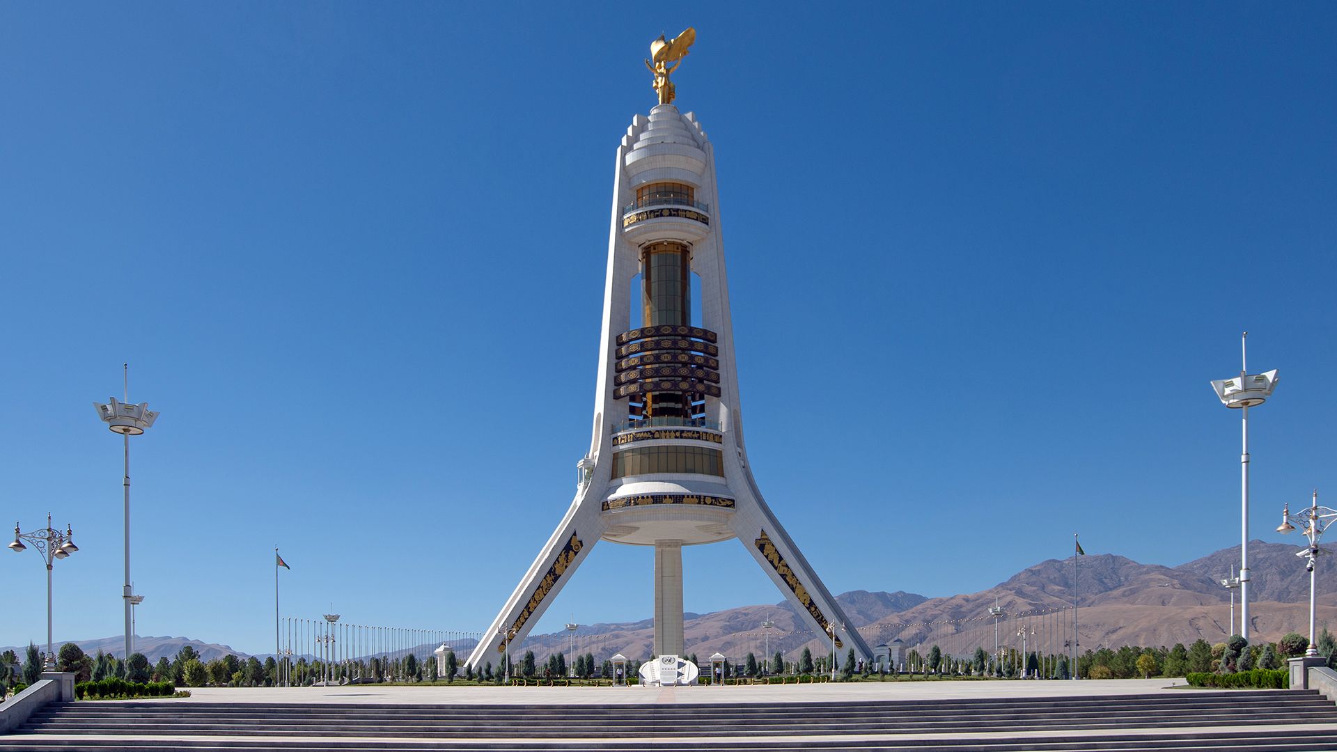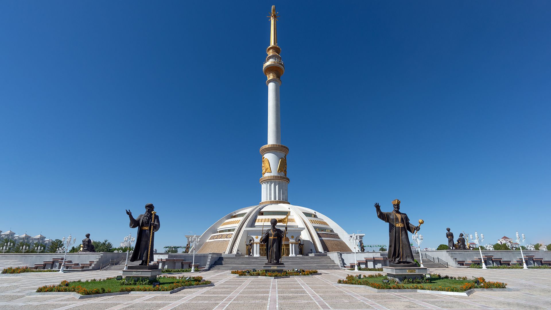 ▼ Das Unabhängigkeitsdenkmal steht im Herzen des Unabhängigkeitsparks, einer der größten Grünanlagen von Aschgabat. Errichtet im Jahr 2000 von der türkischen Firma Polimeks, ist es umgeben von Statuen von Persönlichkeiten aus der turkmenischen Geschichte und Mythologie. Die Maße des Monuments verweisen auf das Unabhängigkeitsdatum Turkmenistans, den 27. Oktober 1991, beispielsweise ist die zentrale goldverzierte Säule exakt 91 m hoch. Der Sockelbau erinnert an eine traditionelle Jurte und beinhaltet u.a. ein Museum, das die Geschichte und Unabhängigkeit Turkmenistans zelebriert.