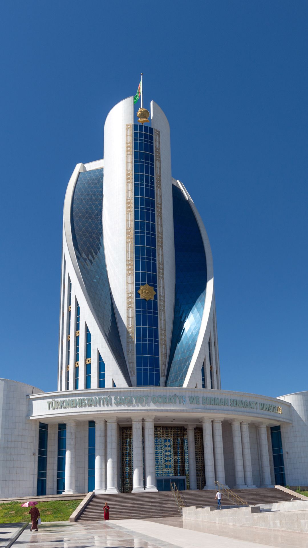 Weitere monumentale Marmorimmobilien entstanden im neuen Klinikviertel. Meist ist ihnen die Fachrichtung bereits anzusehen. Die zentrale Zahnklinik beispielsweise ist einem Backenzahn nachempfunden. Berdimuhamedow, der seine politische Karriere als Leibzahnarzt seines Vorgängers Nijasow begonnen hatte, war persönlich zur Eröffnung gekommen. Das danebenstehende Zentrum für plastische Chirurgie hat die Form eines Handspiegels, die Augenklinik gleicht einem Augapfel und das Gesundheitsministerium selbst ist der Schlange des Äskulapstabs nachempfunden. Trotz allem Prunk: Eine allgemeine Gesundheitsfürsorge gibt es nicht. Ein Arztbesuch ist teuer und viele können sich das nicht leisten. In Aschgabat, wo es sich auch nach westlichen Standards gut leben lässt, kann man schnell vergessen, dass die Mehrheit der Turkmenen das nicht kann. Die meisten kaufen nicht in den hervorragend bestückten Supermärkten und Malls ein, sondern in Läden mit staatlich bezuschussten Lebensmitteln, wo es mitunter zu Angebotsknappheiten kommt.